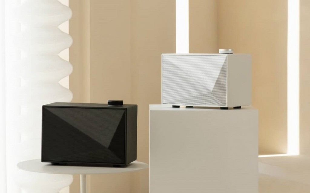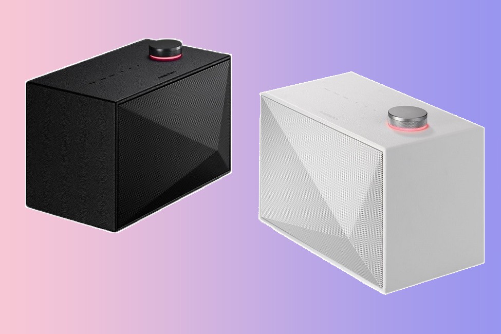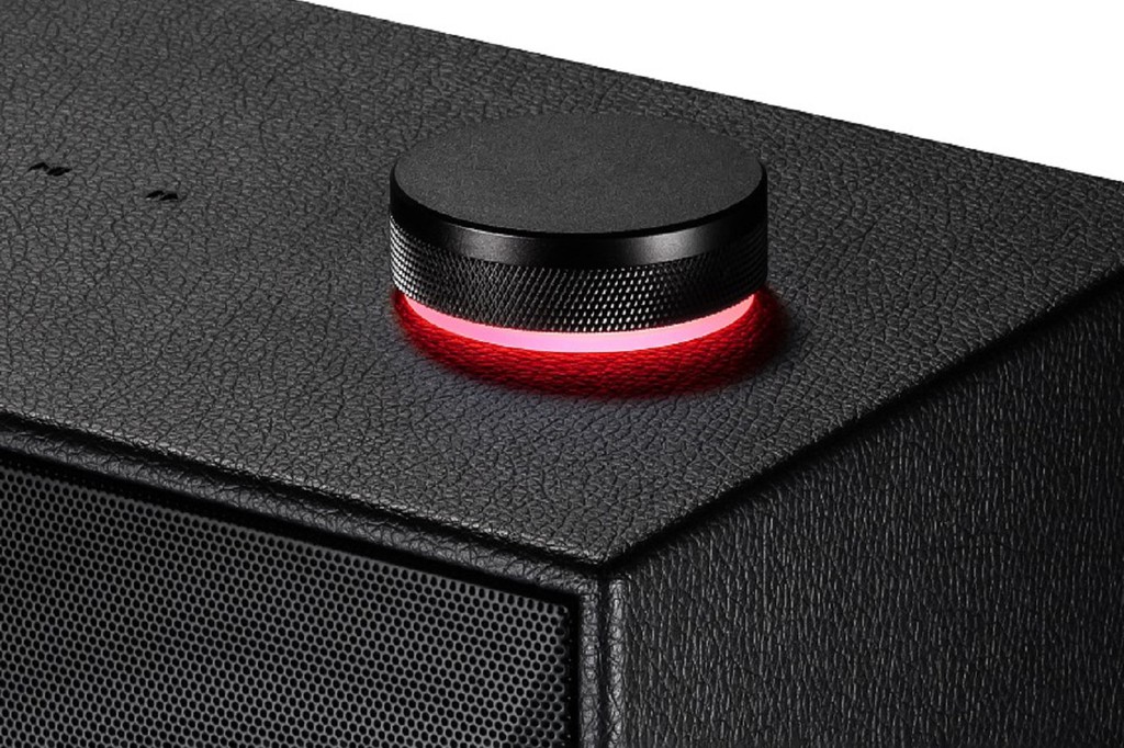 Ở phần trên cùng của loa là núm xoay bằng nhôm có thiết kế nhô lên khá độc đáo. Xung quanh công tắc này là cụm đèn báo chế độ hiện tại và mức âm lượng của loa. Ngoài ra, người dùng có thể tùy chỉnh mức âm treble và bass theo năm cấp độ có sẵn.