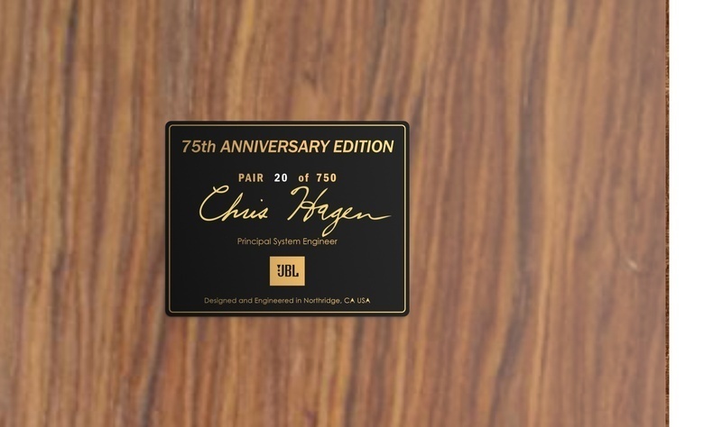 Cụ thể, tấm ốp bằng foam Quadrex đặc trưng nay được gắn logo JBL màu vàng - đen rất nổi bật, đi cùng là huy hiệu đánh dấu phiên bản đặc biệt gắn ở mặt trước và sau thùng loa gỗ. Hơn nữa, một trong hai huy hiệu sẽ có cả chữ ký của kỹ sư trưởng Chris Hangen cùng số thứ tự của từng cặp loa. Chân kê JS-120 đi cùng với L100 Classic 75 cũng được trang trí bằng các chi tiết nghệ thuật nhằm tăng thêm giá trị của đôi loa.