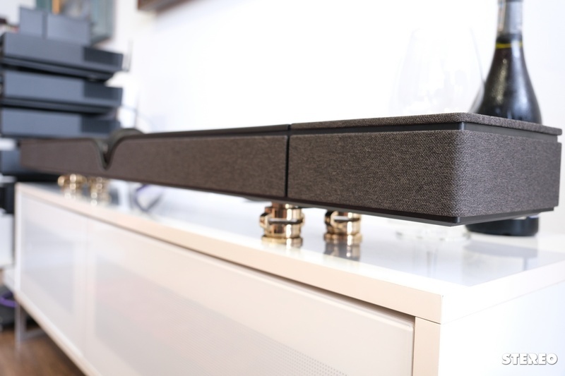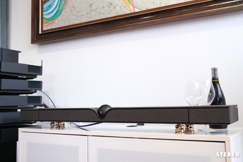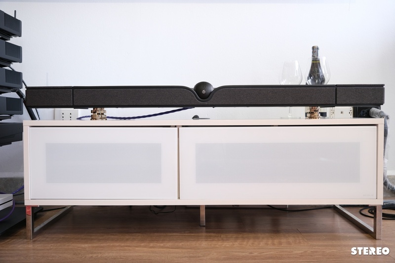 Nhờ chiều cao chỉ 77mm, Devialet Dione vẫn nổi bật nhưng không choán mất tầm nhìn khi được đặt ngay dưới TV