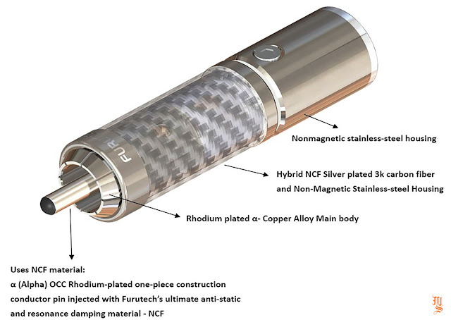 Đối với CF-120 NCF, Furutech đã phát triển một cấu trúc có độ phức tạp cao nhằm tối ưu hiệu quả truyền dẫn tín hiệu cũng như chống lại toàn bộ tác động từ nhiễu. Điểm nổi bật ở thiết kế này là jack cắm mạ Alpha OCC Rhodium có lõi được lấp đầy bằng hỗn hợp NCF.