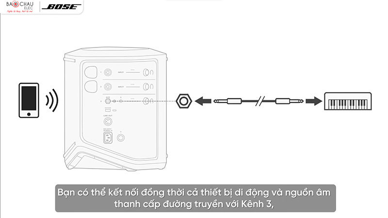 - Hệ thống cho phép người dùng kết nối đồng thời một thiết bị di động (qua Bluetooth) và một nguồn âm thanh cấp đường truyền (line-level qua cổng 3.5mm hoặc 6.3mm) vào Kênh 3. Âm thanh từ cả hai nguồn này sẽ được hệ thống phát ra cùng lúc.