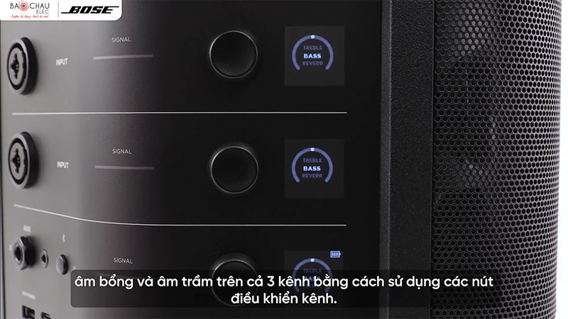 - Người dùng có khả năng tinh chỉnh các thông số âm lượng (Volume), âm bổng (Treble), và âm trầm (Bass) cho cả ba kênh (Kênh 1, 2, và 3) bằng cách sử dụng các núm điều khiển (control knobs) tương ứng cho từng kênh.