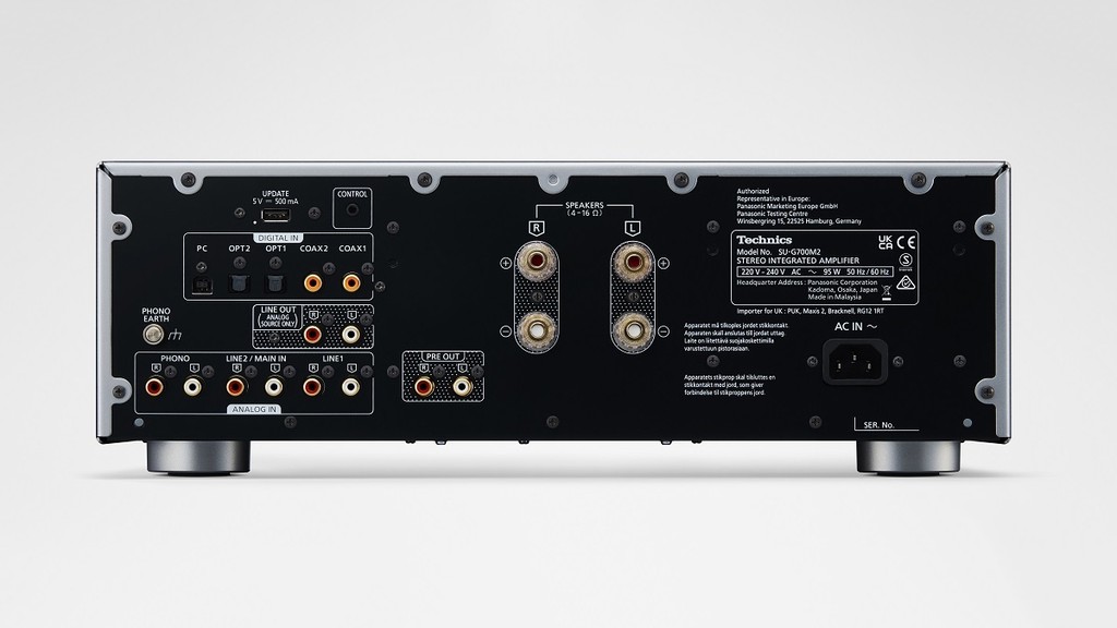 Về thiết kế, Technics vẫn giữ nguyên thiết kế cho SU-G700M2 với khối chassis dày bằng nhôm phay xước. Điểm nhấn mặt trước đó là mặt đồng hồ VU dài được chiếu sáng bằng đèn LED cùng màu bên trong. Nút xoay chỉnh âm lượng được làm với kích thước vừa phải và đặt ngay tâm của máy, đối xứng 2 bên là nút nguồn và nút chọn đầu vào với màn hình hiển thị thông tin nhỏ. Cổng headphones 6mm vẫn được giữ nguyên đúng vị trí từ phiên bản trước. Mặt sau của máy là các cổng đầu vào, bao gồm 2 cổng Opt, 2 cổng Coax, 1 cổng Pre-out. Hơn nữa, Technics còn trang bị thêm cổng phono MM/MC kết nối với mâm than dành cho những người yêu thích analog, đặc biệt hơn là khả năng tối ưu hóa đĩa vinyl cũ bằng tính năng đảo pha từ bộ chọn đầu vào.