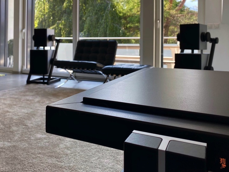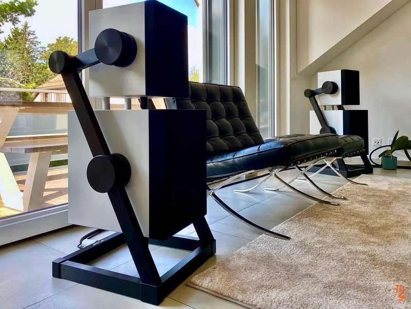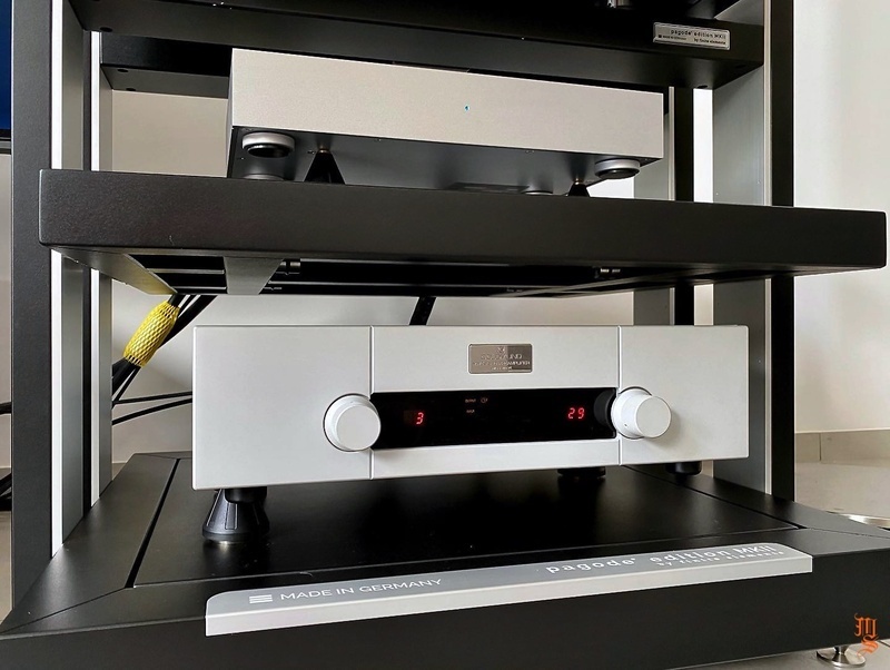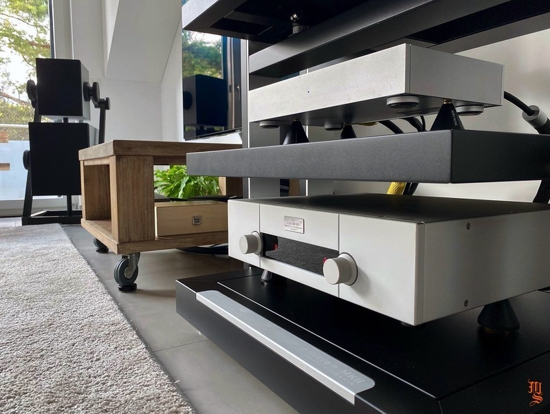 Cận cảnh hệ thống sau khi hoàn tất quá trình lắp đặt và cân chỉnh để cho ra âm thanh phù hợp với không gian phòng nghe. Qua hình ảnh, có thể thấy nhân vật chính của hệ thống này là đôi loa Samadhi Active với thiết kế độc đáo, có 2 buồng âm riêng biệt (buồng ở trên chứa tweeter và midrange, buồng còn lại chưa woofer cùng các họng thoát hơi bass), đi kèm là preamp của Goldmund và kệ máy cao cấp Pagode (Đức).